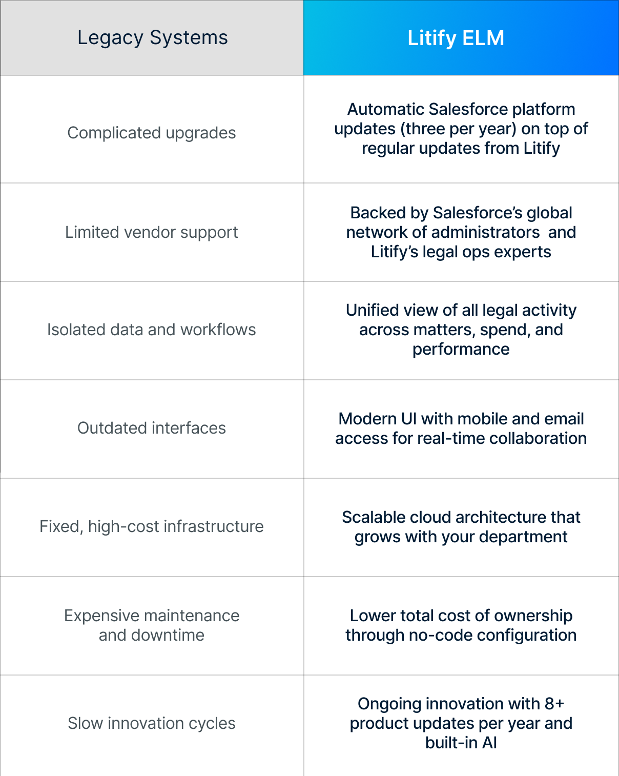 Legacy systems leave legal departments exposed to risk. They rely on small vendors and outdated code, which makes every update uncertain.