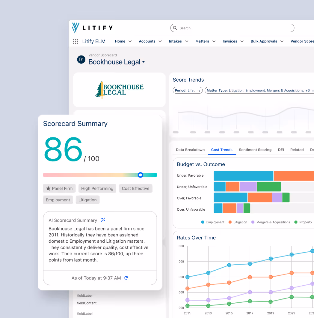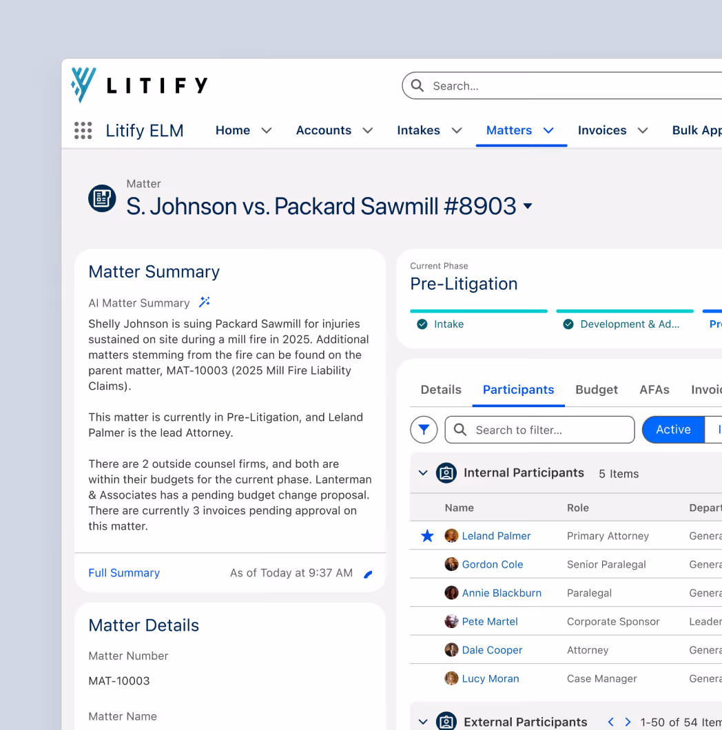Yes. Litify tracks all internal matters, while also managing budgets, billing rules, invoice reviews, and performance metrics for outside counsel in one unified system.
