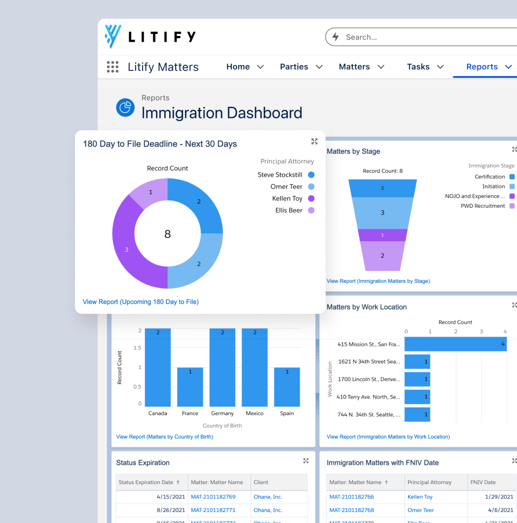 Immigration firms experience an increase in efficiency and transparency into their business by using Litify’s immigration law software. Specifically, consumer firms see an increase in intake conversion rates and marketing ROI, reduction in time to case submission, and overall growth of their business. Business immigration firms see similar benefits as well as a measurable increase in corporate client satisfaction and repeat business. Check out more client benefits on our customer page.