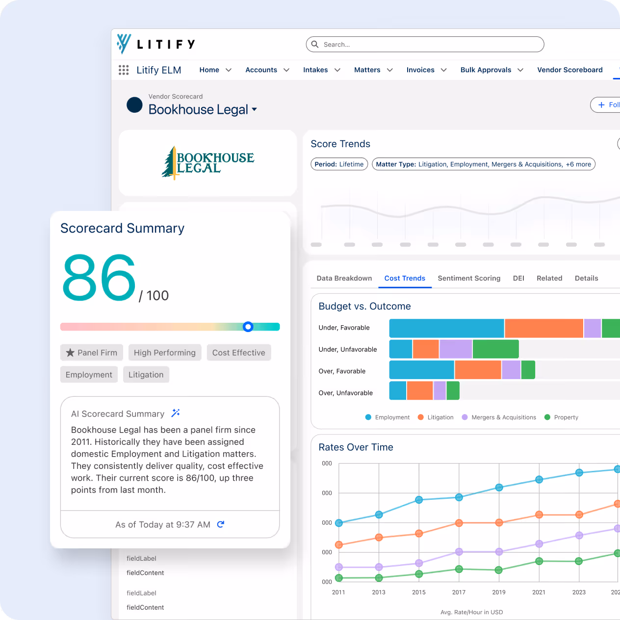 Yes. Litify tracks all internal matters, while also managing budgets, billing rules, invoice reviews, and performance metrics for outside counsel in one unified system.